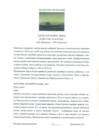 Экспертиза картины проведена старшим научным сотрудником Отдела искусства Старых мастеров Государственного Музея Изобразительных Искусств имени А.С.Пушкина, кандидатом искусствоведения Познанской А.В. |